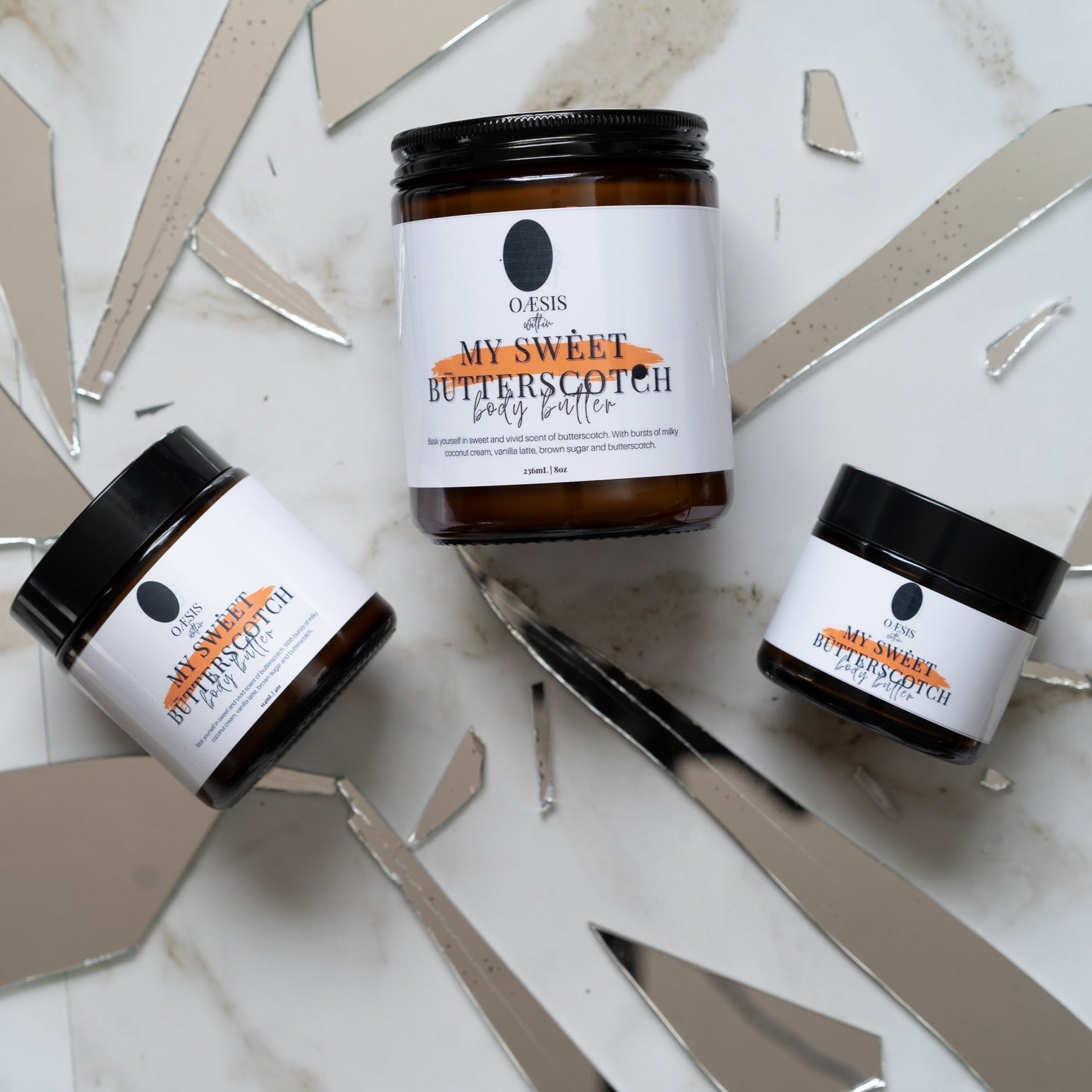 Indulge in sweet butterscotch scent. Its symphonic blend of milky coconut cream and vanilla latte embraces you luxuriously. Our body butter, scented with enchanting butterscotch, melts into skin, offering softness and a delicate caress.